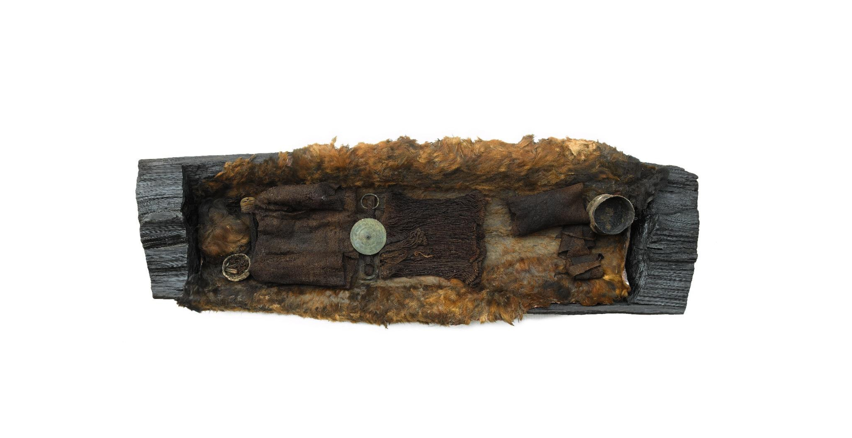 One female for whom new analyses have suggested quite a different mobility pattern from that of the Skrydstrup Woman is the Egtved Girl. The Egtved Girl was a contemporary of the Skrydstrup Woman, as she was buried in an oak coffin within a monumental burial mound in Jutland during a similar period.43 Although the Skrydstrup Woman and the Egtved Girl both wore short wool blouses,44, 45 the Egtved Girl’s skirt was very different from that of the Skrydstrup Woman. The Egtved Girl’s short corded (or string) skirt is an iconic clothing item from the Bronze Age which has been found on approximately 60 other individuals across Europe, and is sometimes associated with a ritual role.46, 47 For this reason, as well as the bronze sun disc found at her waist, the Egtved Girl has often been interpreted as a sun-priestess.47 In addition to the corded skirt and belt disc, Egtved Girl’s grave included two bronze bracelets,43, 48 a comb, a bark container with part of the cremated remains of a 5- or 6-year-old child, a textile bundle with the rest of the remains of the child,49 and a bucket with residues of what seems to have been beer.43, 50, 51