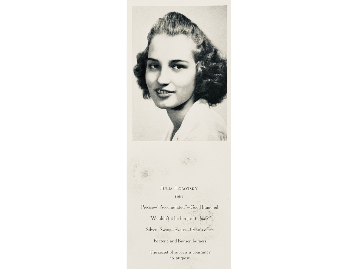 After graduating in 1943 as Salutatorian, magna cum laude, with a dual degree in Chemistry and Biology, Julia joined a fellow graduate at the American Cyanamid Research Laboratories, where she worked for a year as a Microbiology Assistant. The labs were located in Stamford, Connecticut and the two girls roomed on the ocean with a lovely but lonely woman who had taken over her father’s plumbing company. The landlady would serve them cereal and kugel with lemon slices for breakfast before they headed out six days a week to search for another penicillin. For three to four months, Julia searched for compounds that would inhibit bacteria, but soon felt she was stagnating—she had easily mastered the job’s necessary skills. This frustration led to an assignment on a different project within the company, where she tested the half-life of anti-staphylococcus drugs in mice. Just as before, Julia mastered the new skills quickly and came to the realization that these kinds of jobs were “dead-end roads” for her. She did not have the information needed to set up experiments herself and so she decided to go back to school.