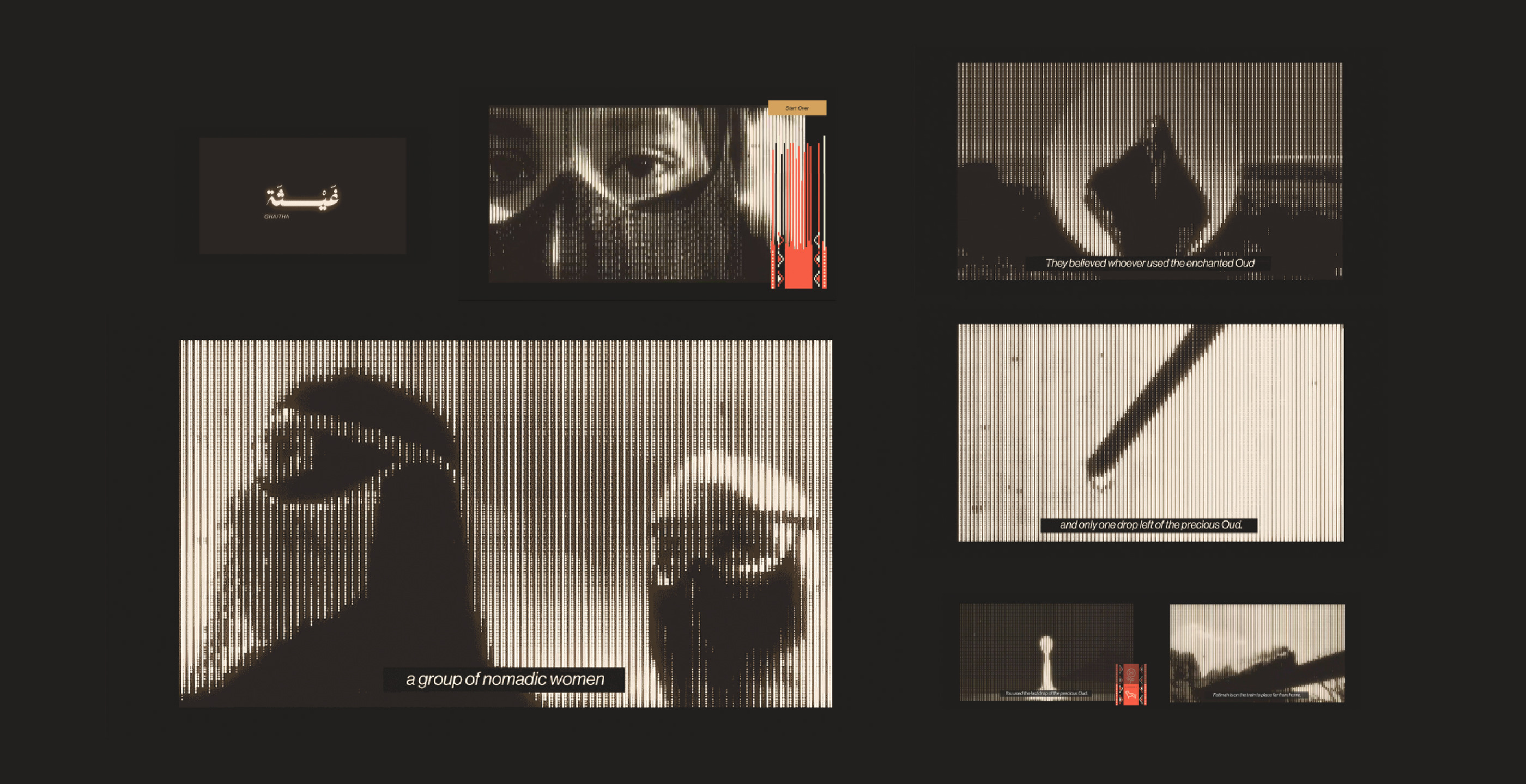 Teeb Al-tybat is a non-linear interactive narrative, crafted using Keynote. The format allows audiences to make decisions throughout the story, which influence its outcome. A fictional tale of a enchanted oud bottle with the real-life stories. It explores the lineage of my bedouin Hijazi foremothers highlighting their true experiences through a lens of Imagination.