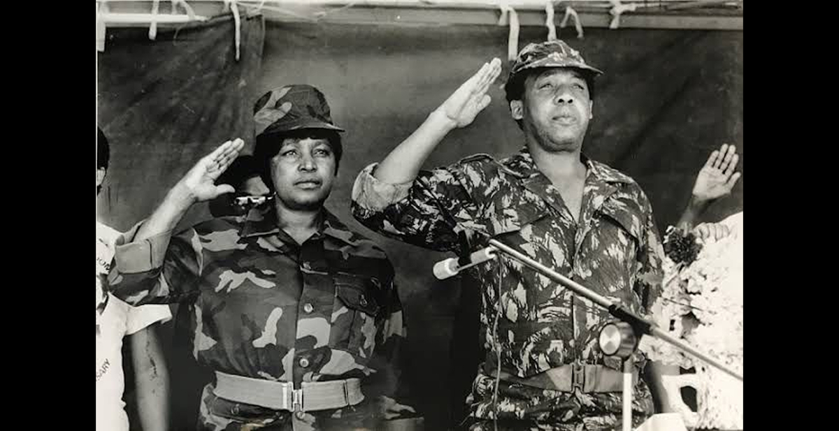 Winnie Mandela and Chris Hani, key Umkhonto We Sizwe commanders in camouflage uniforms during a 1980s anti-apartheid rall