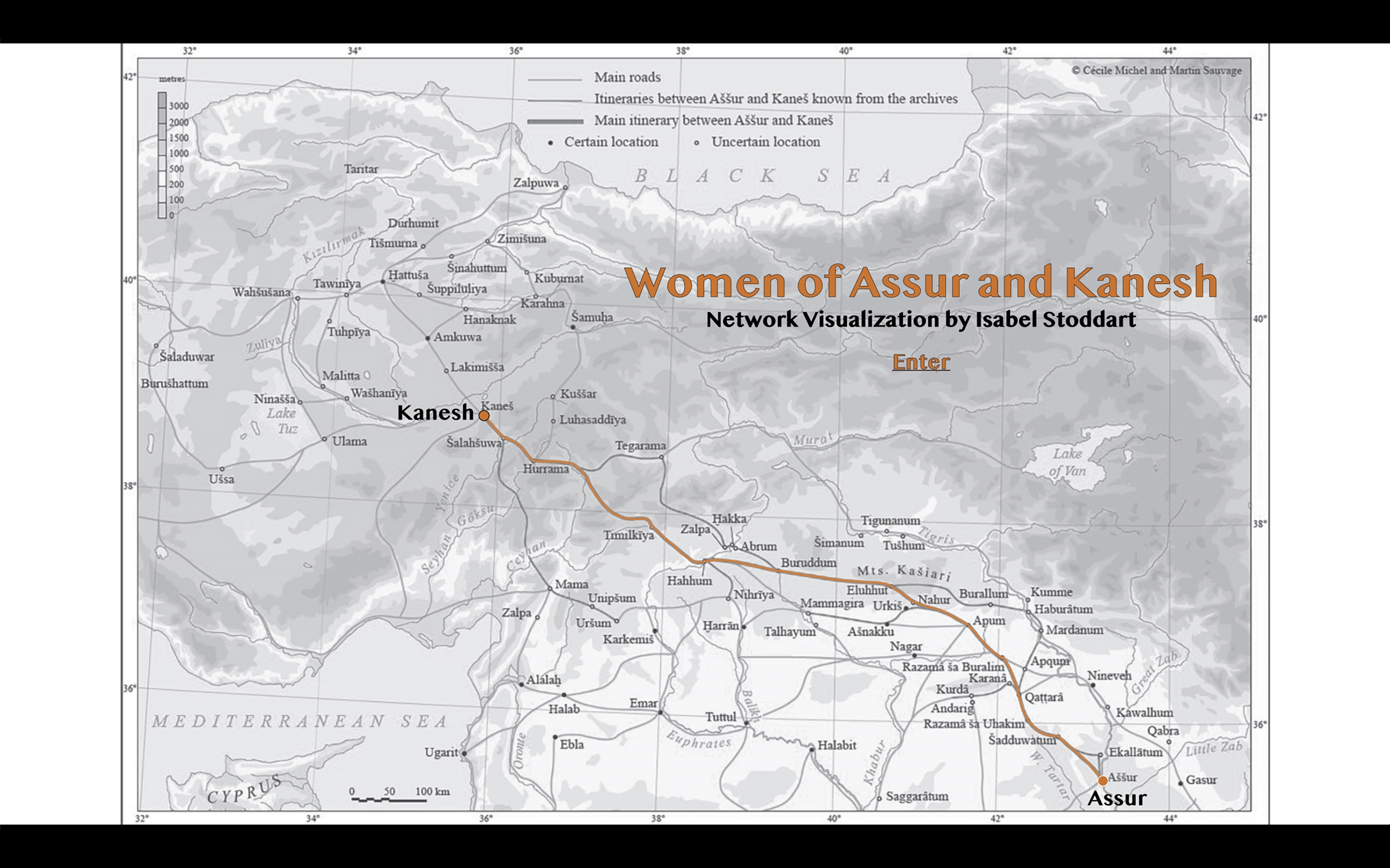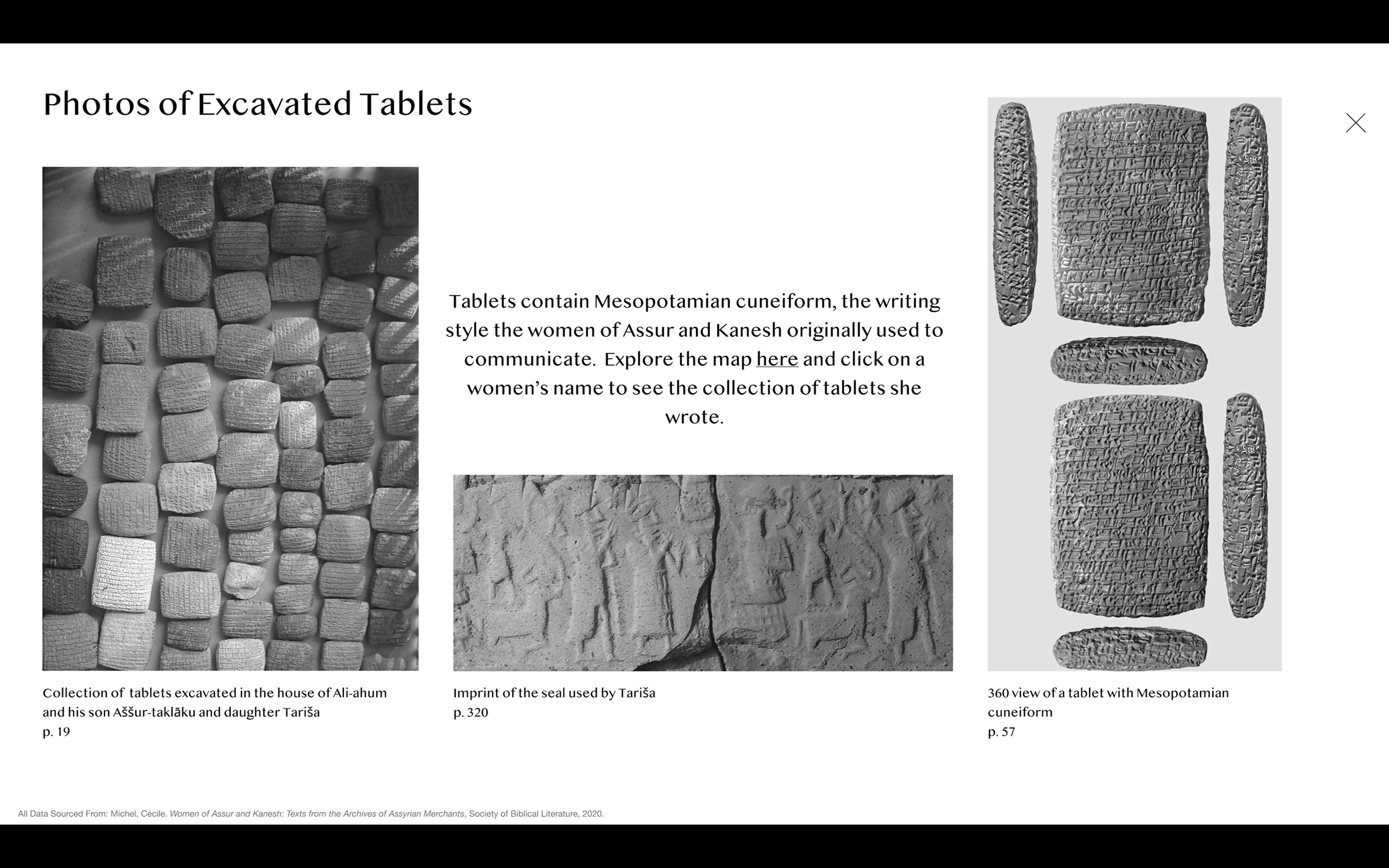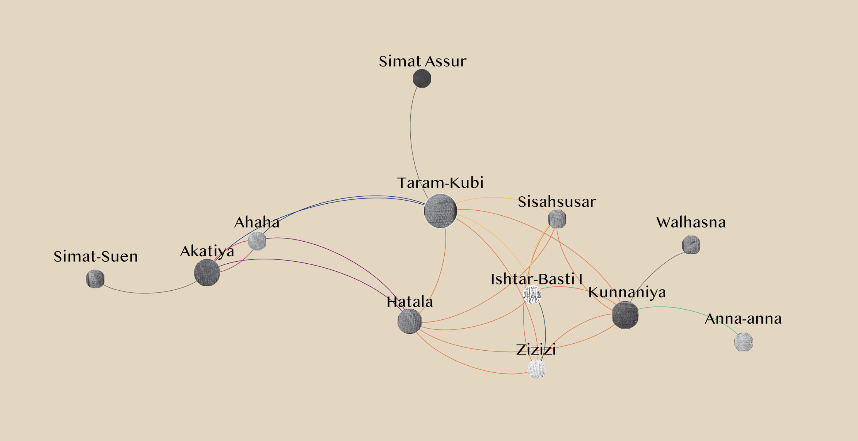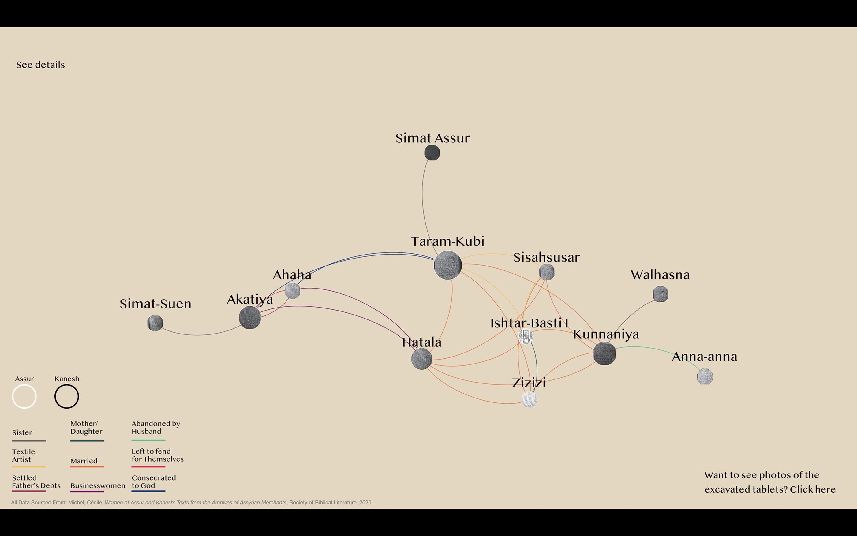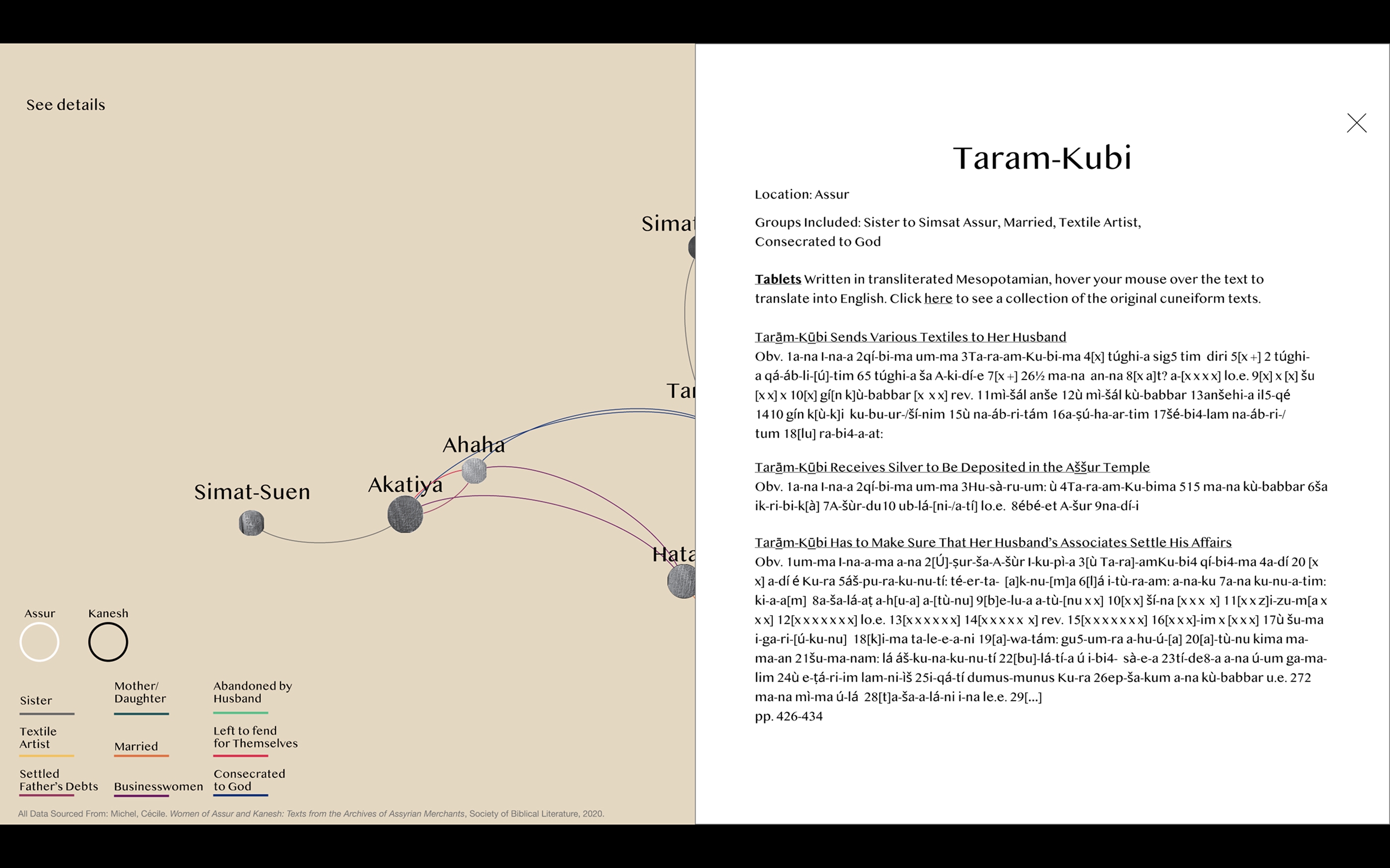 Data Visualization allows us to see connections that otherwise may go unnoticed. This project uses visualization to explore relationships between and among the women documented in Women of Assur and Kanesh: Texts from the Archives of Assyrian Merchants (2020) by Cécile Michel. The excavated tablets provide insight into the lives of women in ancient Mesopotamia, many of whom managed textile businesses and handled family finances and debts.